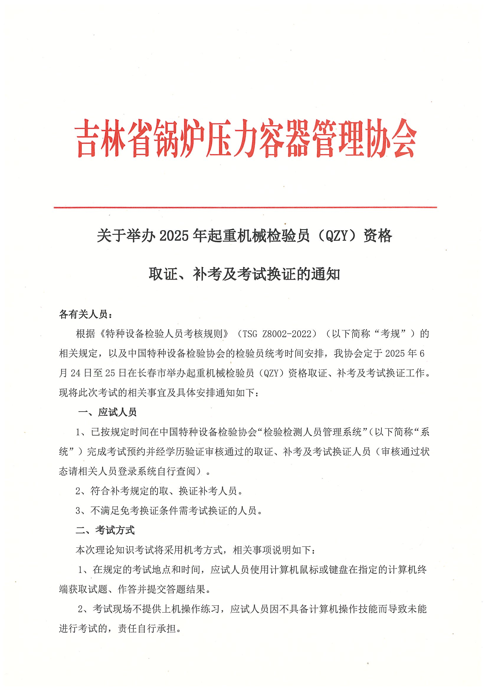 关于举办2025年起重机械检验员(QZY)资格取证、补考及考试换证的通知